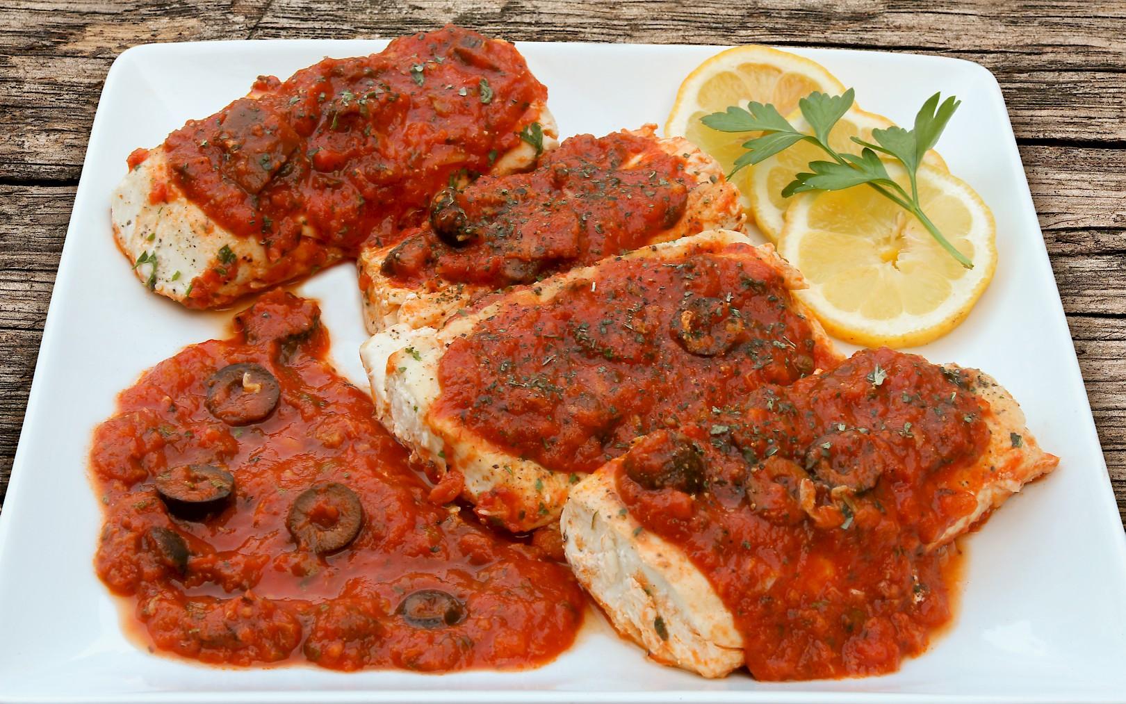 - Spoon puttanesca sauce onto a platter, lay fish over the sauce, and spoon more sauce over the fish.