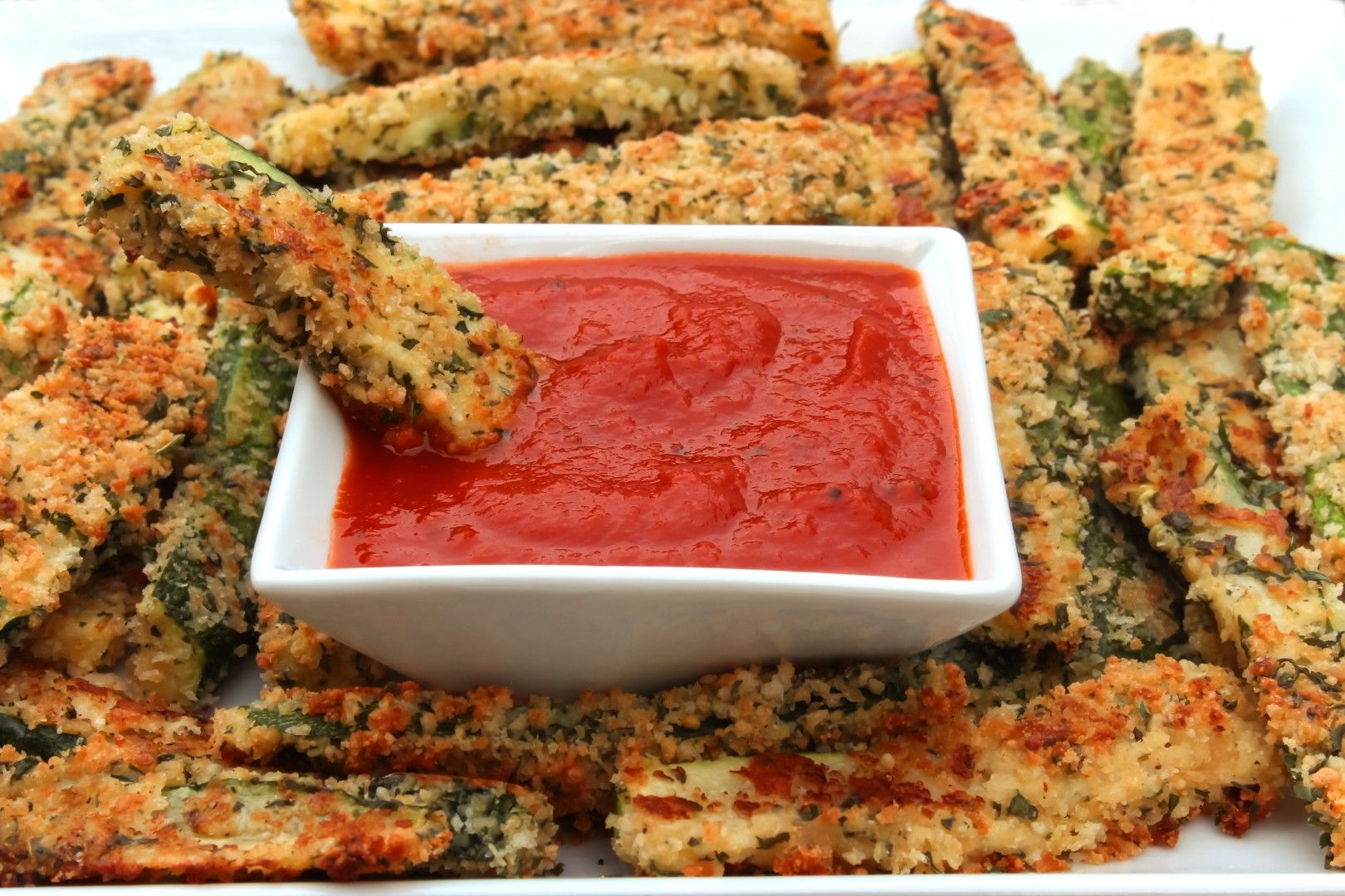 9. Serve zucchini fries on a plate with a small serving bowl of sauce for dipping.