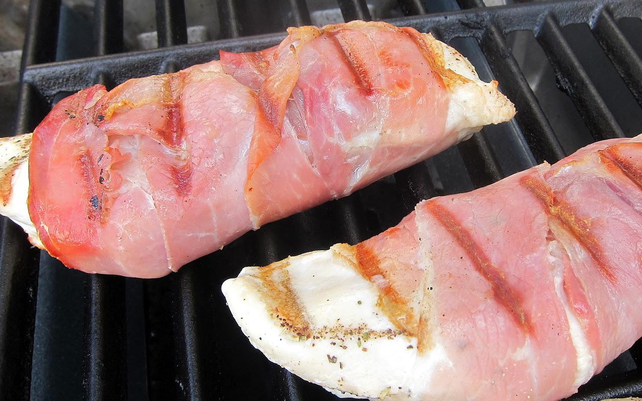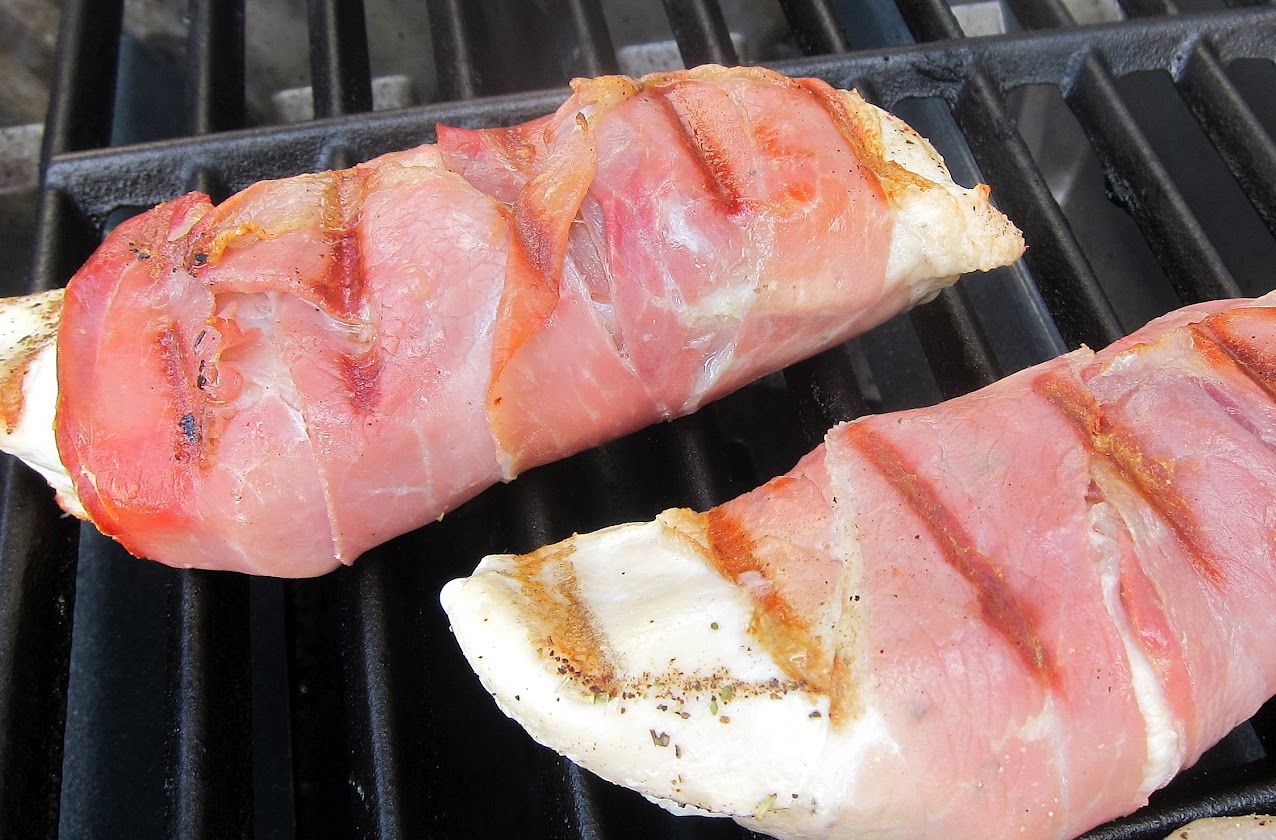 - Place prosciutto-wrapped chicken on grill until prosciutto is crisped and the chicken is cooked through, approximately 20 minutes.