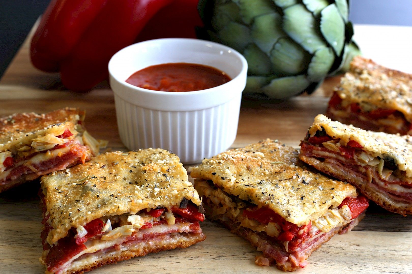 - Top with artichoke hearts, roasted red peppers, and olives.
