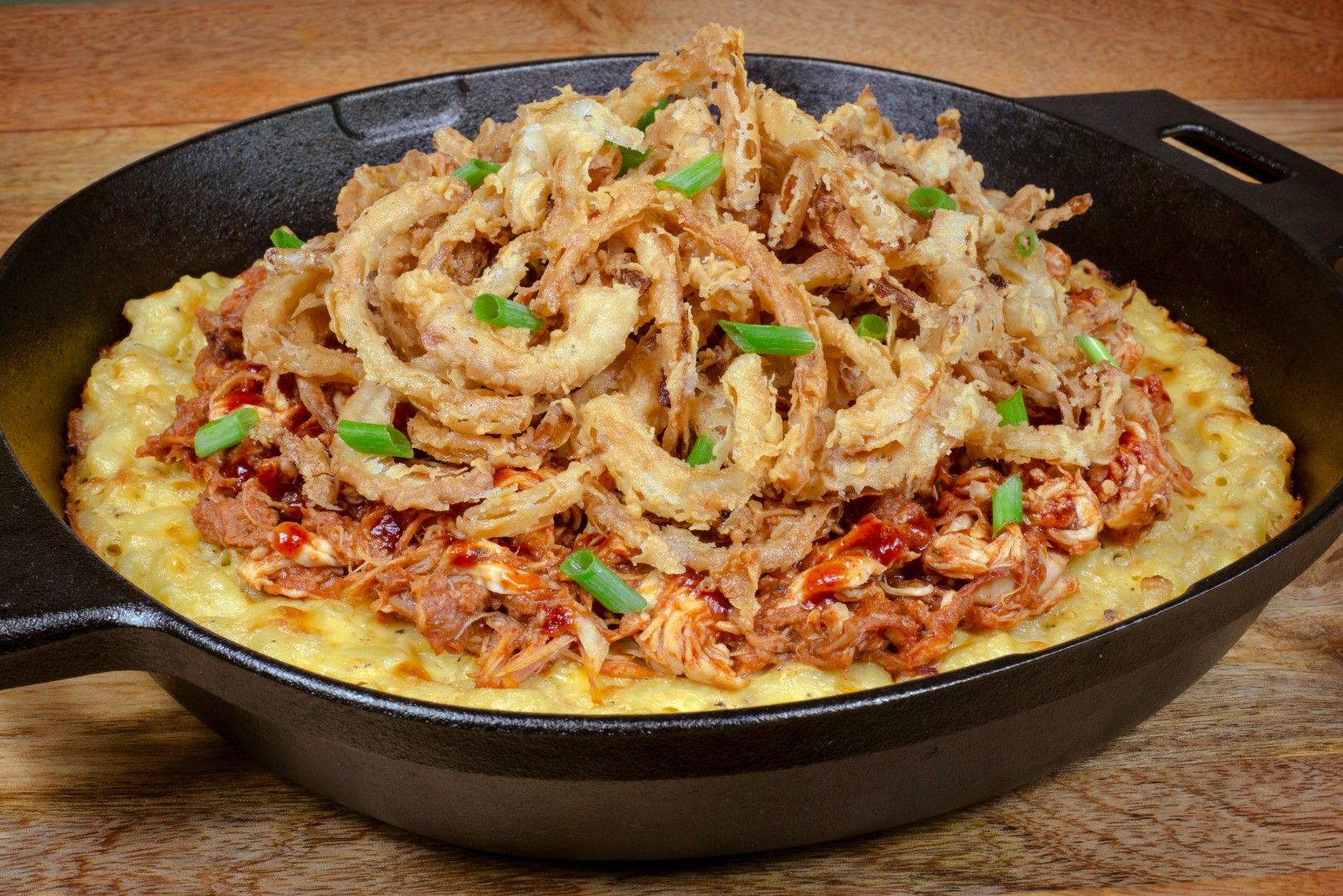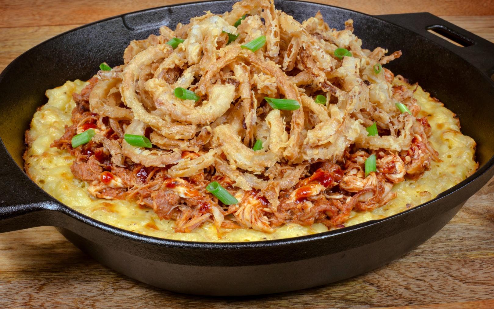 - When macaroni and cheese is done, top with meat and crispy onions.