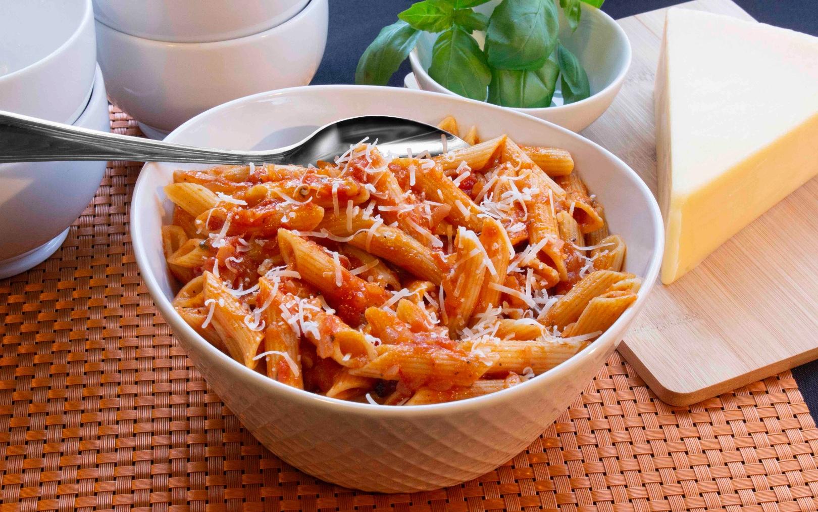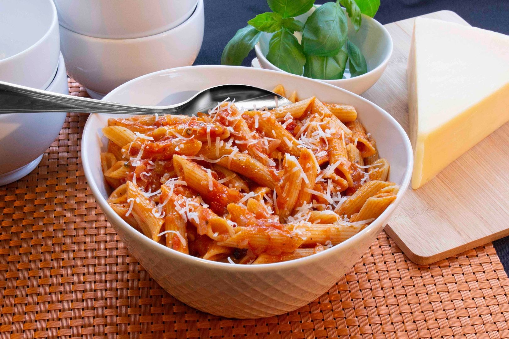 - When the pasta reaches al dente (firm to the bite), add the marinara sauce. Stir and cook for 1-2 minutes until heated through.