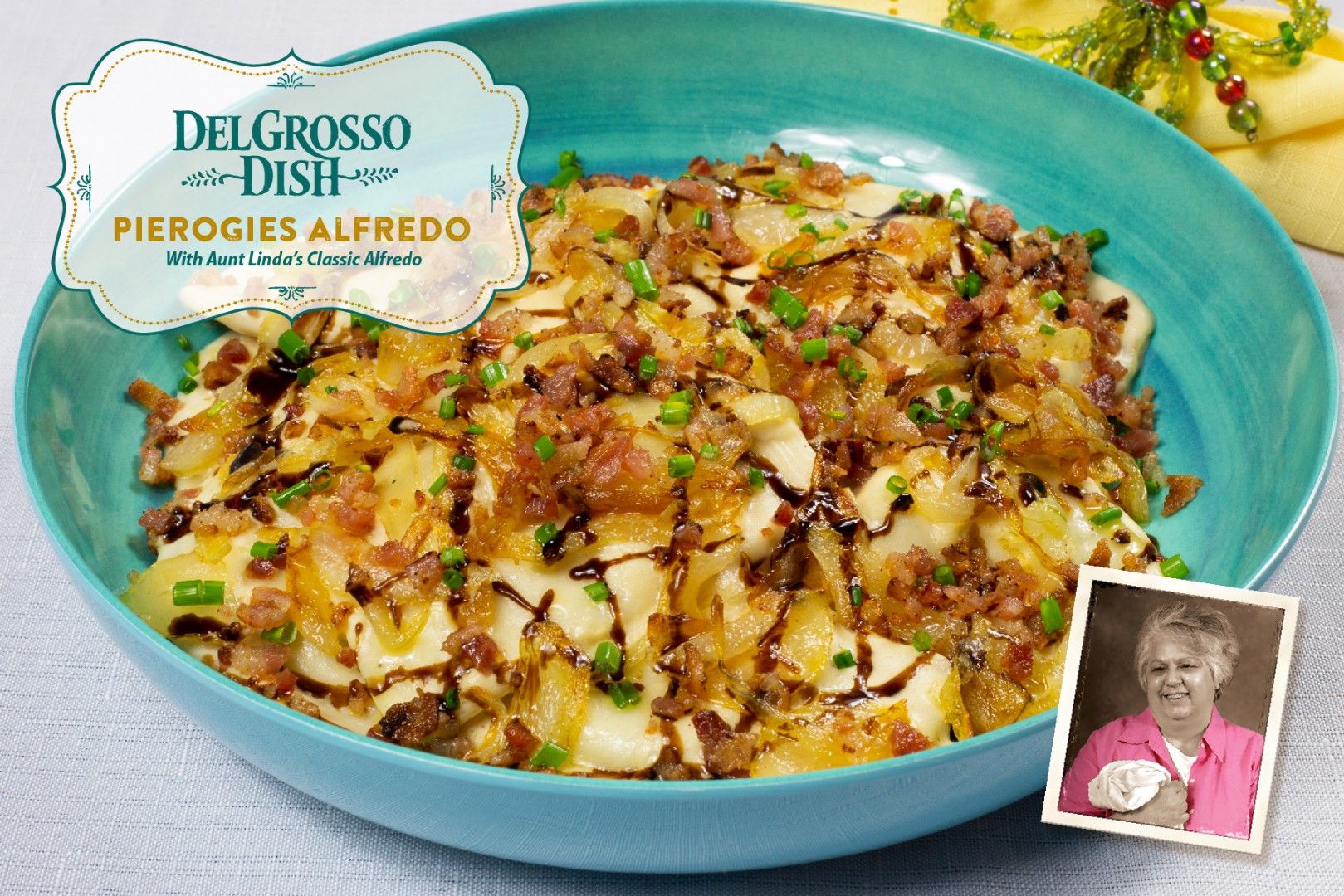 8. Spoon caramelized onions over each plate of pierogies then drizzle with balsamic glaze.