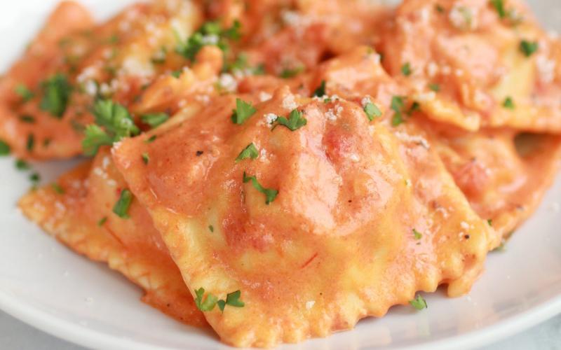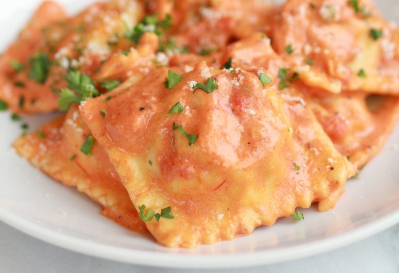 5. Place ravioli in a baking dish and pour sauce over pasta.
