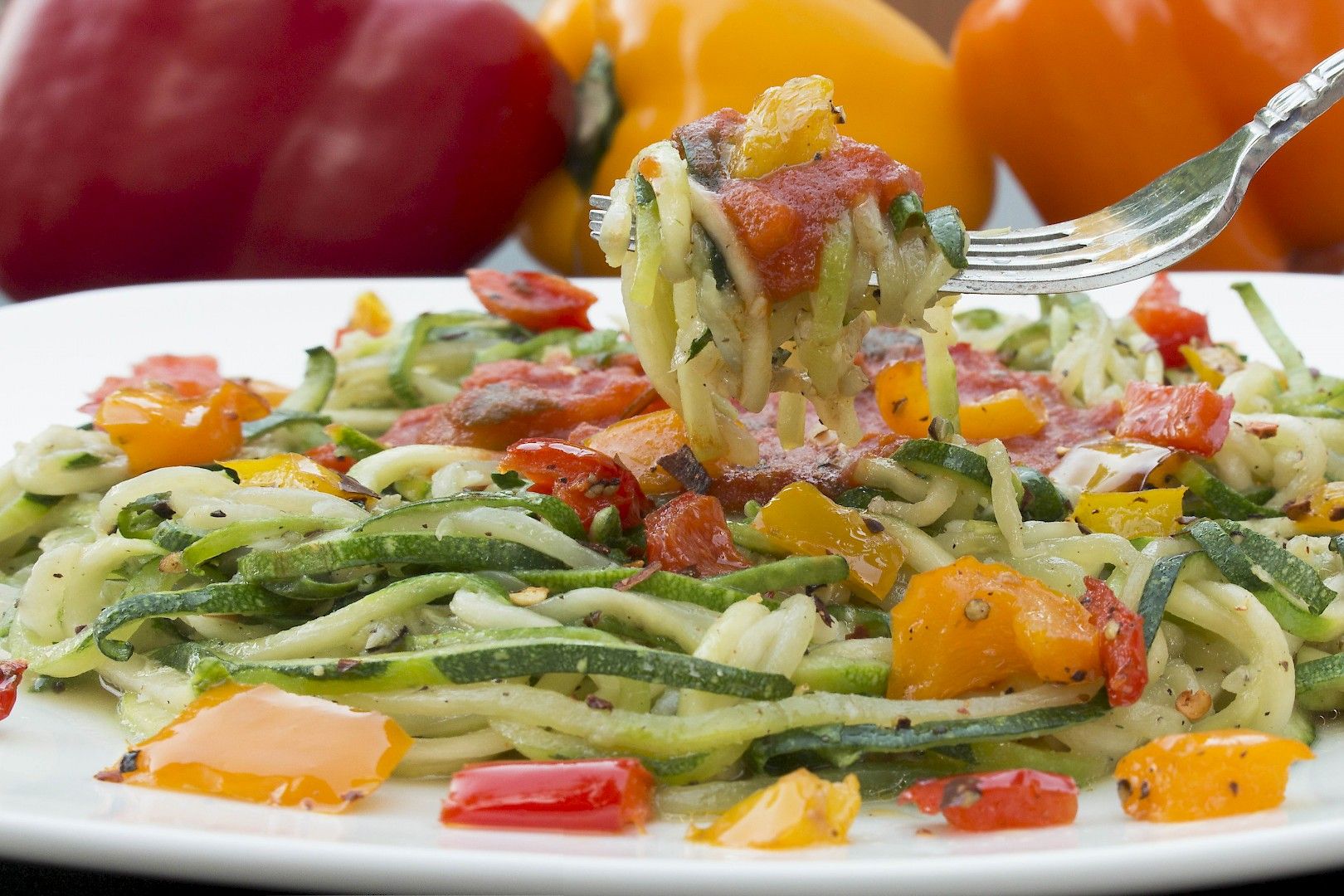 - Serve zucchini noodles on a plate or in a bowl, add sauce, then top with chopped peppers.