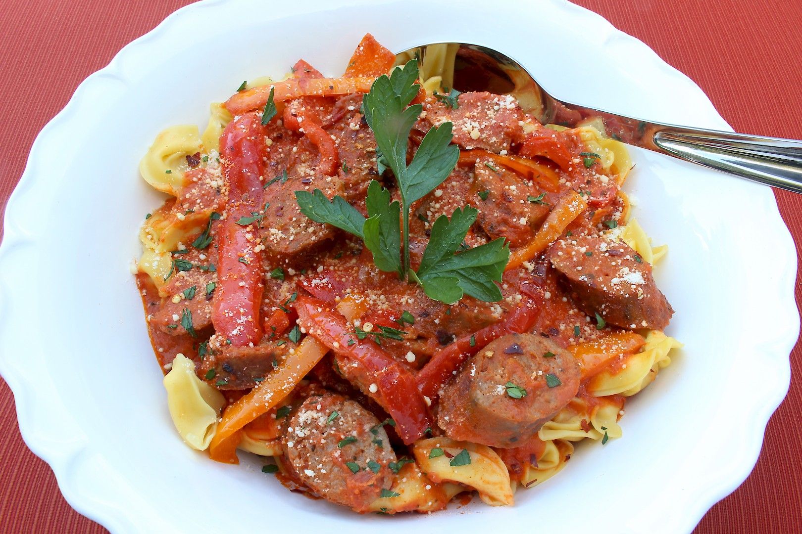 - Drain pasta and add to your favorite pasta bowl. Pour sauce, sausage, and peppers over the tortellini.