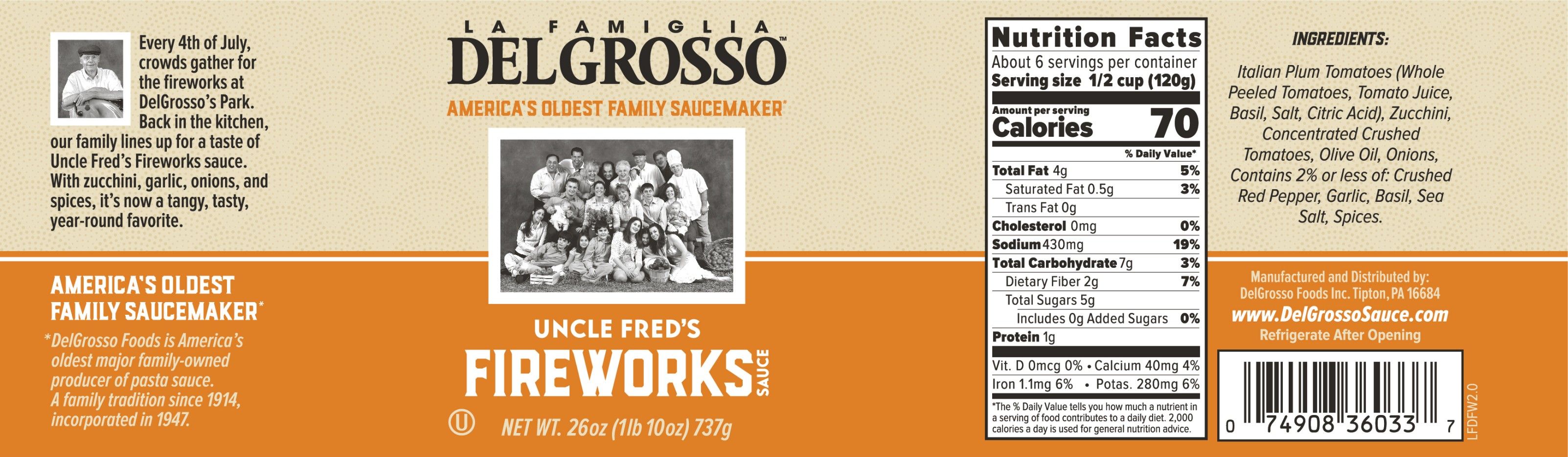 Every 4th of July, crowds gather for the fireworks at DelGrosso's Park. Back in the kitchen, our family lines up for a taste of Uncle Fred's Fireworks sauce. With zucchini, garlic, onions, and spices, it's now a tangy, tasty, year-round favorite.