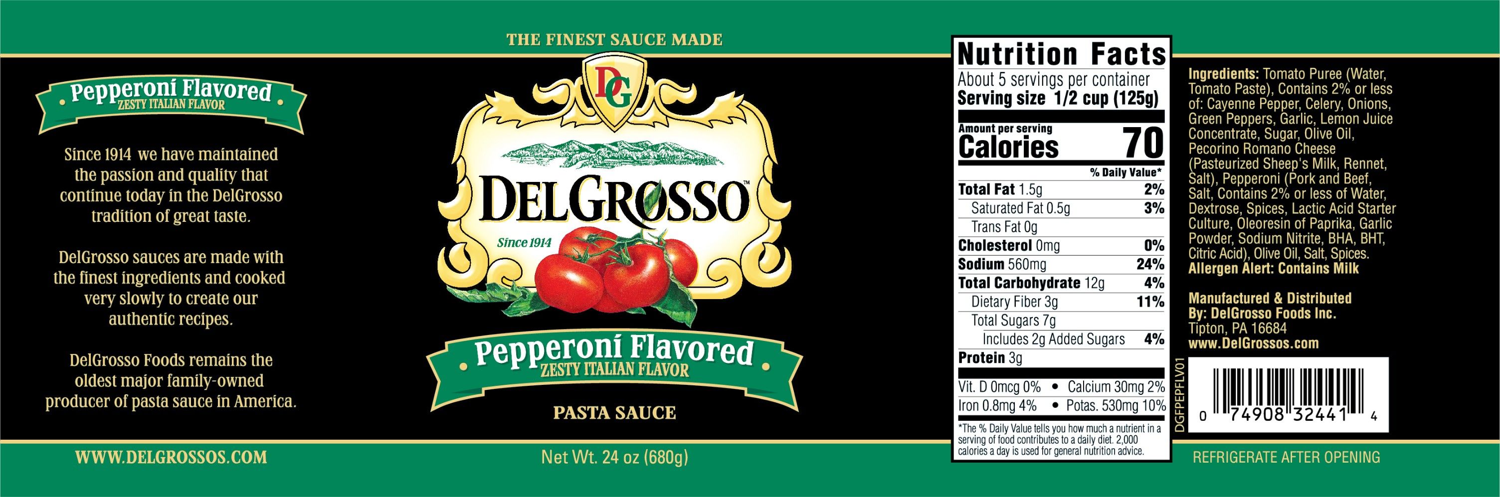- Tomato Puree (Water, Tomato Paste), Fresh Onions, Pepperoni (Pork and Beef, Salt, 2% or less Water, Dextrose, Natural Spices, Oleoresin of Paprika, Lactic Acid Starter Culture, Garlic Powder, Sodium Nitrate, BHA, BHT, Citric Acid), Sugar, Salt, Fresh Celery, Olive Oil, Pecorino Romano Cheese (Pasteurized Sheep’s Milk, Salt, Cheese Culture, Enzymes), Green Peppers, Spices, Garlic and Lemon Juice. Allergen Alert: Contains Milk